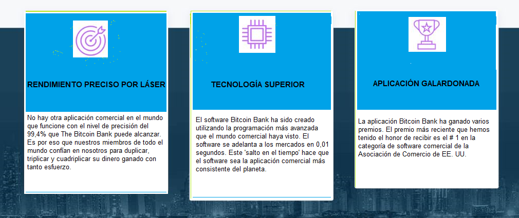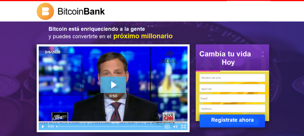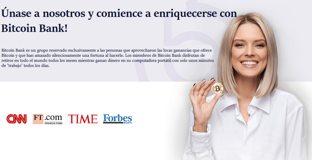 Bitcoin Bank es una nueva forma de supuestamente generar ingresos pasivos. Bitcoin Bank puede describirse como una plataforma de negociación automatizada, que opera automáticamente y tiene la capacidad de generar mayores ganancias comprando y vendiendo criptomonedas con una tasa de ganancia de más del 90%.