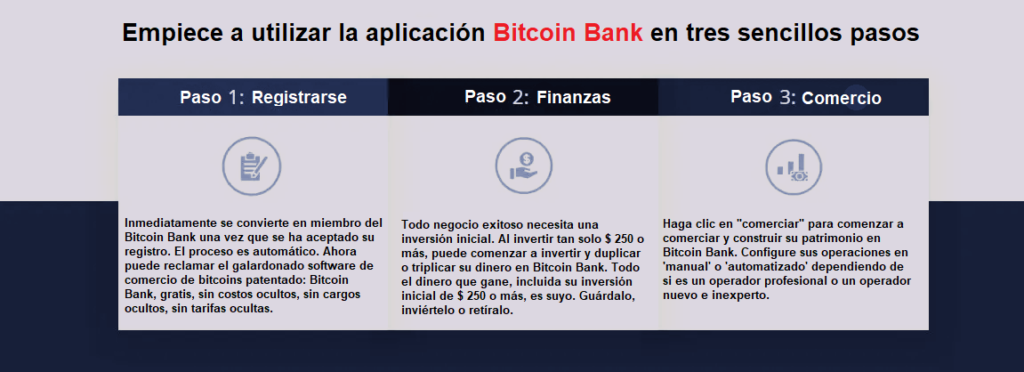 Bitcoin Bank es una nueva forma de supuestamente generar ingresos pasivos y puede describirse como una plataforma de negociación automatizada, que funciona automáticamente y tiene la capacidad de generar mayores ganancias comprando y vendiendo criptomonedas con una tasa de ganancia de más del 90%.