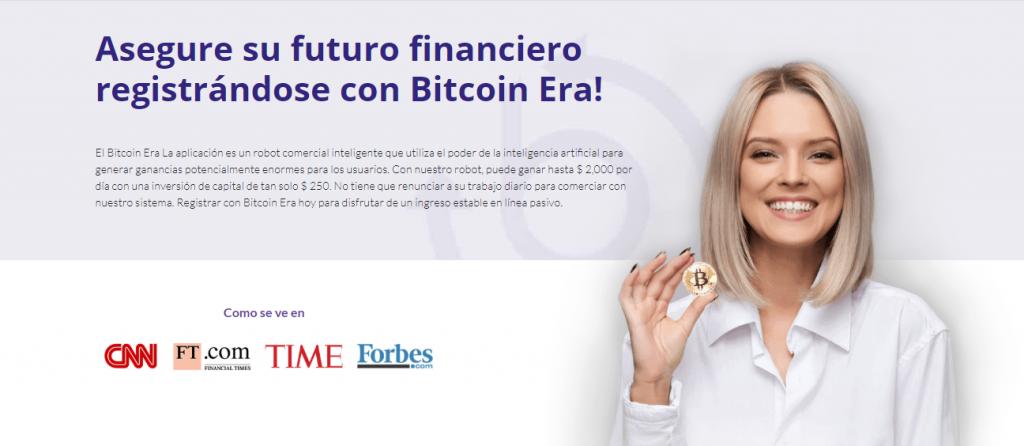 Es conocido como el robot Bitcoin, que fue creado para ayudar a los comerciantes a involucrarse en el comercio de Bitcoin para ganar dinero. Funciona colocando operaciones automáticamente para los operadores que solo necesitan configurar los ajustes y activarlos. Hubo reclamos sobre el software de estafa Bitcoin Era, pero ninguno ha sido probado o confirmado.