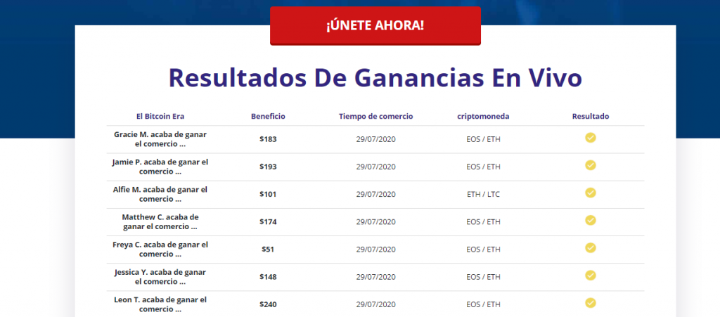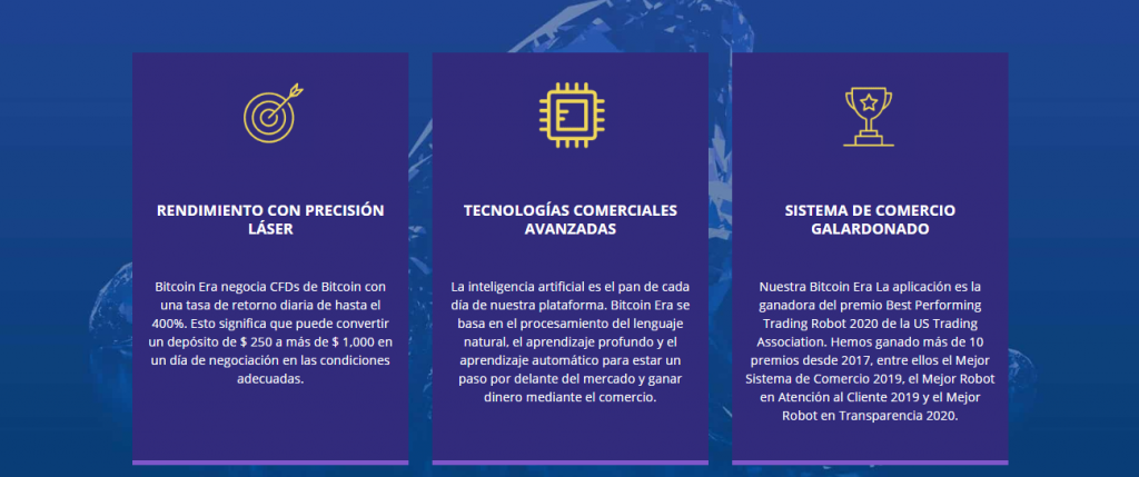 Nuestras revisiones indican que la plataforma de comercio de criptomonedas tiene abundantes características que han llamado la atención de la población mundial interesada en el comercio de criptomonedas. Además, se observa que el bot de la de Bitcoin Era es instantáneo y más rápido que cualquiera de los otros robots disponibles en el mercado.