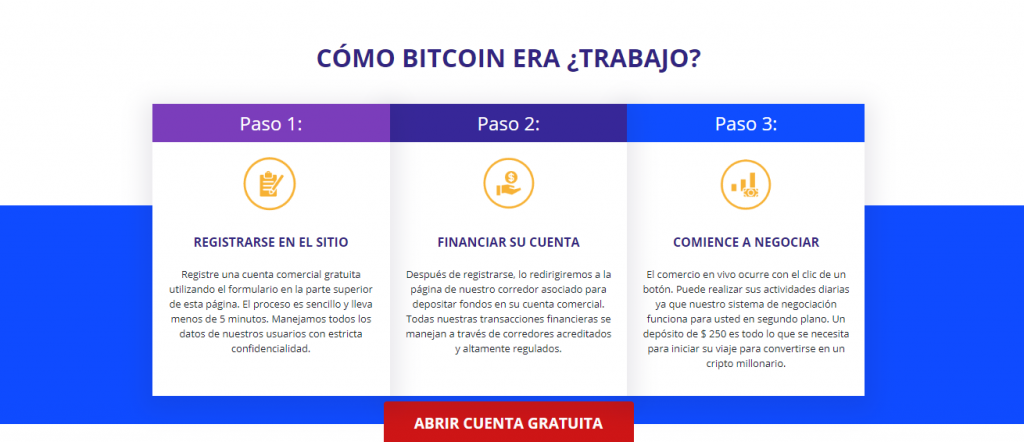Los operadores que desean comenzar a usar la cuenta de operaciones de la de Bitcoin Era deben invertir una cantidad mínima; Una vez que se crea una cuenta, pueden comenzar a operar y ganar mucho dinero. La compañía se aseguró de que el comerciante obtenga la mejor tarifa durante cualquier momento del día, al automatizar completamente el robot para ayudar a los comerciantes a obtener la máxima relación de ganancias. Por lo tanto, cuanto más invierta, más posibilidades tendrá de obtener ganancias.