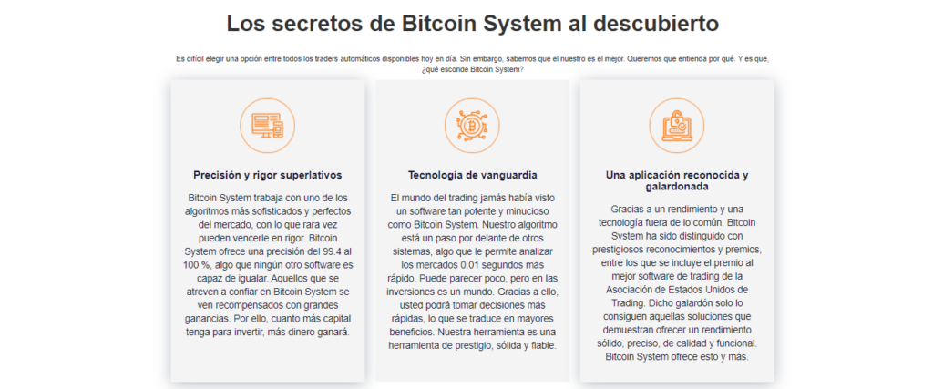 Bitcoin System es un software automatizado basado en algoritmos informáticos que están bien versados en el comercio de criptomonedas . Bitcoin System se creó debido a la popularidad de los robots de comercio automático. Este software afirma que es 0.01 segundos más rápido que el movimiento del mercado, debido a esto, estudió el patrón del mercado temprano y resultó en un comercio rentable.