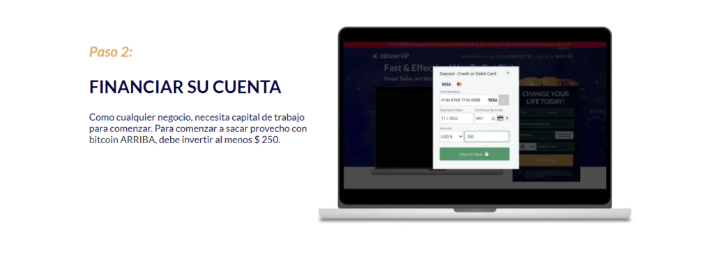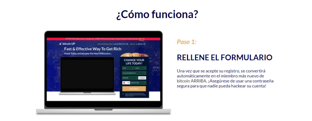 bitcoin UP tiene un mecanismo de registro muy simple y directo. Los recién llegados pueden acceder fácilmente a esta plataforma registrándose para abrir una cuenta comercial. El primer usuario debe completar el registro disponible en el sitio para abrir una cuenta, una vez que la cuenta se activa, el usuario debe realizar el pago inicial de $ 250 para comenzar a operar en esta plataforma de operaciones en línea. Los siguientes son los pasos para abrir una cuenta con bitcoin UP :