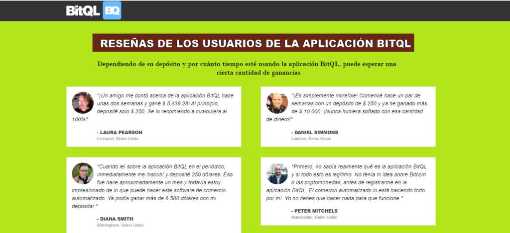No hemos creído en la información escrita sin cotejar los hechos y las cifras. Los testimonios de los clientes se proporcionan en la página oficial, pero no los creímos sin verificarlos. Nos pusimos en contacto con los usuarios existentes de este sistema y supimos que los miembros están realmente contentos con este sistema comercial y les están diciendo a otros que usen este sistema. Le hemos mostrado todas las funciones importantes de este sistema, no hemos encontrado ningún problema en este sistema, BitQL es un sistema de comercio auténtico y legítimo.