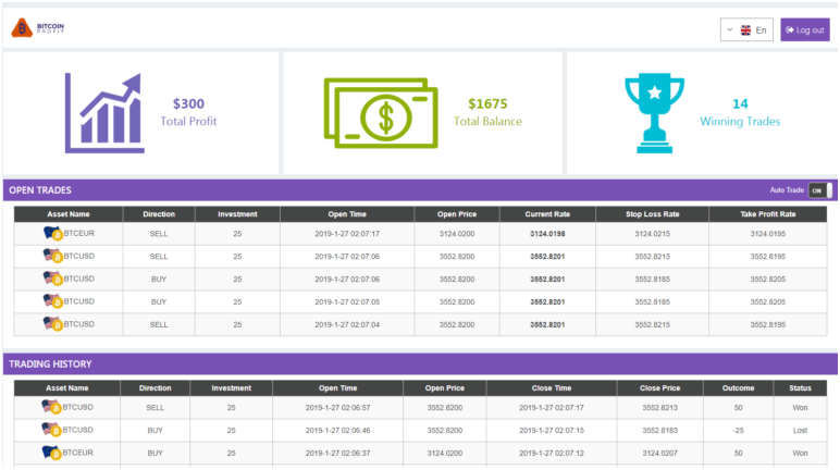 La cuenta de demostración le permite comenzar en $ 1500 USD. Es ficticio, y si quieres usarlo, solo tienes que hacer clic en Auto Trade “ON”, y Bitcoin Profit realizará todas las operaciones automáticamente.